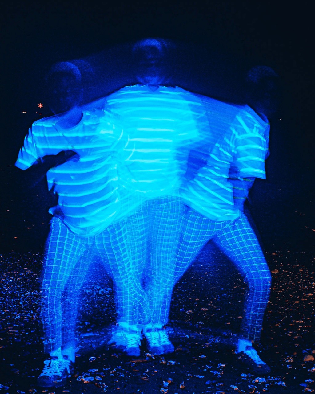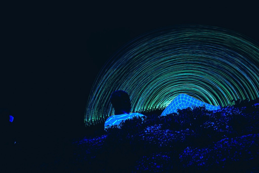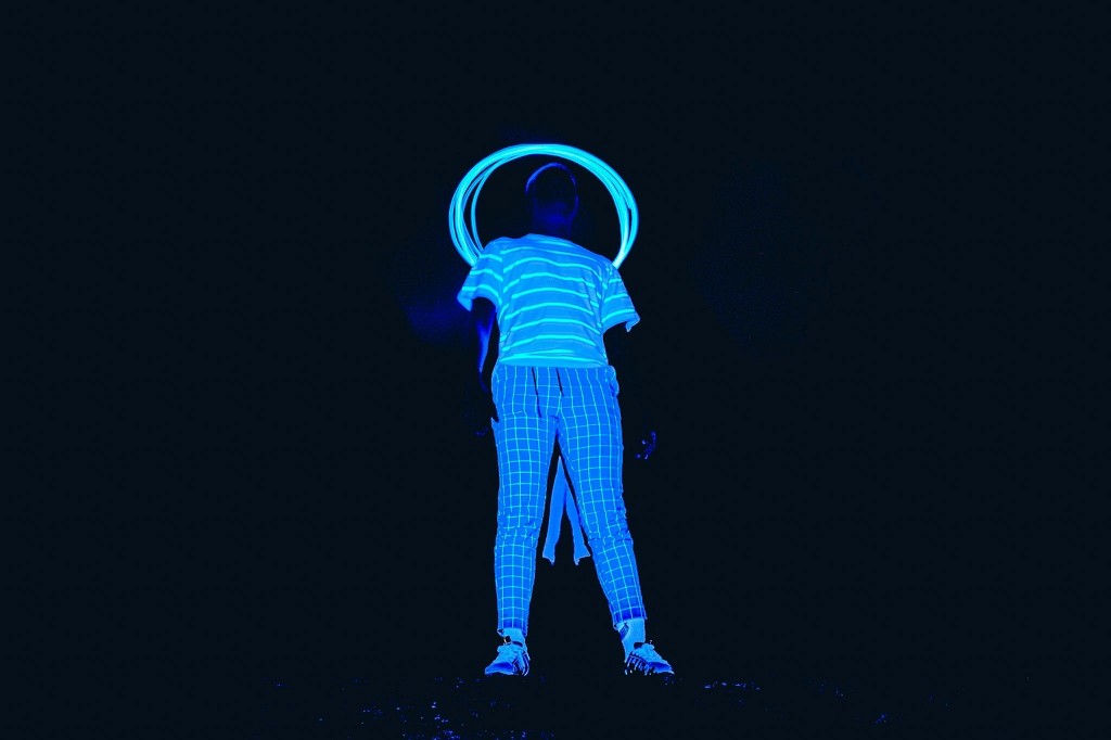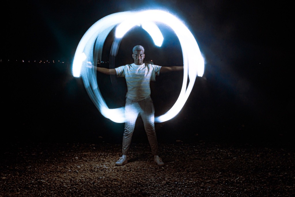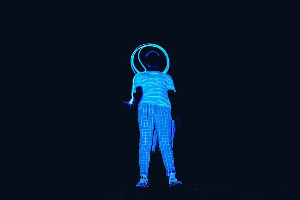 Le nom DYEUS REPLICAT puise dans la mythologie indo-européenne, où DYEUS est le ciel lumineux, une force divine originelle. Associé à “REPLICAT”, il évoque une divinité dont chaque geste, capturé en lumière, devient une empreinte immortelle, une réplique parfaite mais éphémère. La technique de la longue exposition renforce cette idée en multipliant les mouvements du modèle, transformant chaque cliché en une œuvre qui transcende le temps. Cette approche, croisant influences cyberpunk et mythologiques, sublime le pouvoir de la lumière et du mouvement, plaçant le spectateur face à une divinité vivante et intemporelle.