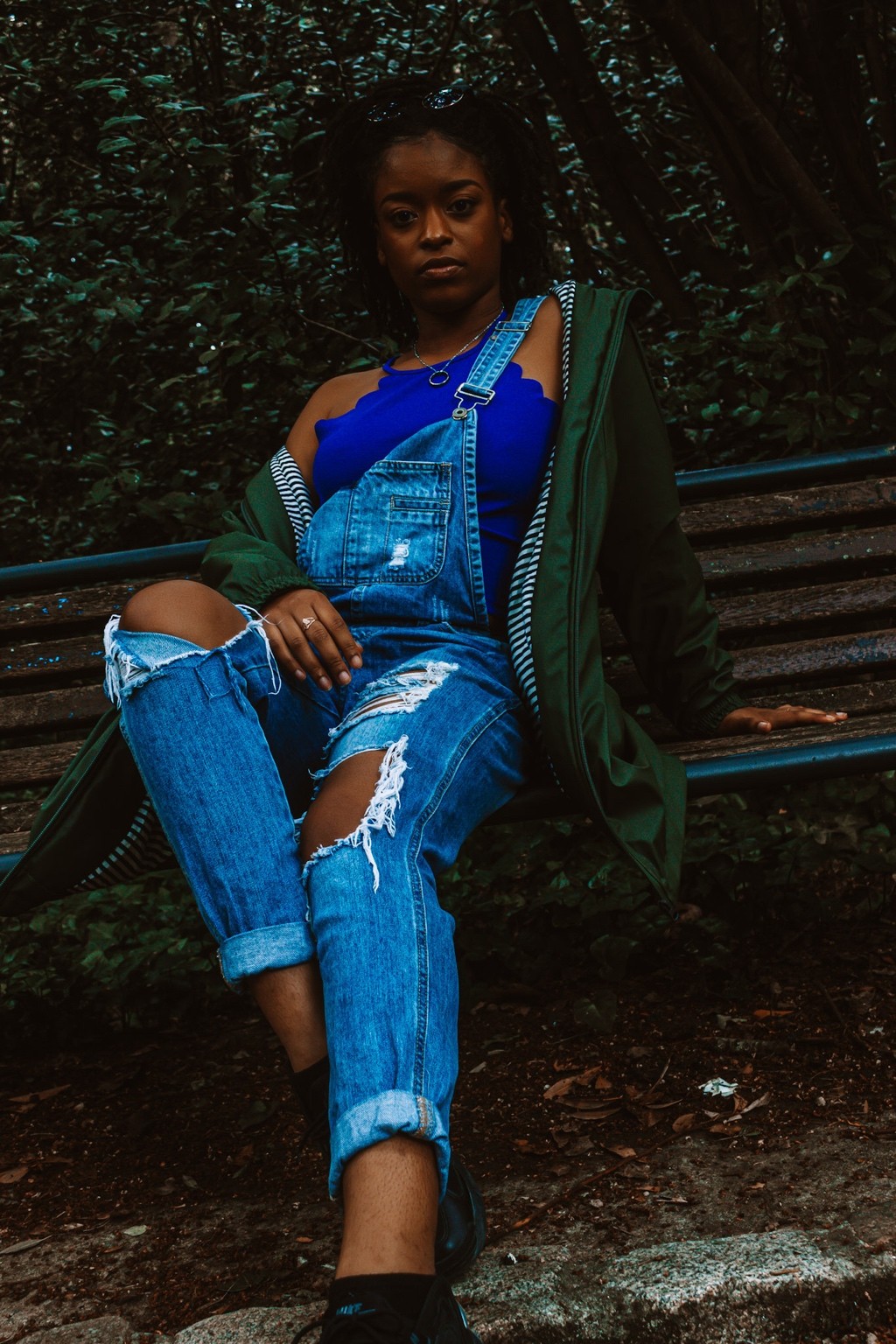 Le nom ELECTRIC BLOOM joue sur cette juxtaposition entre le bleu vibrant et le décor forestier. Le mot BLOOM (qui signifie ‘éclosion’) symbolise l’énergie vive et la jeunesse qui s’épanouit de façon inattendue dans un cadre assombri. Il évoque également une résonance sonore avec le mot “bleu” en français, ajoutant un jeu subtil qui renforce la présence centrale du haut bleu électrique porté par le modèle. ELECTRIC BLOOM devient ainsi une image de contraste lumineux, d’éclosion colorée au cœur d’un monde éteint.