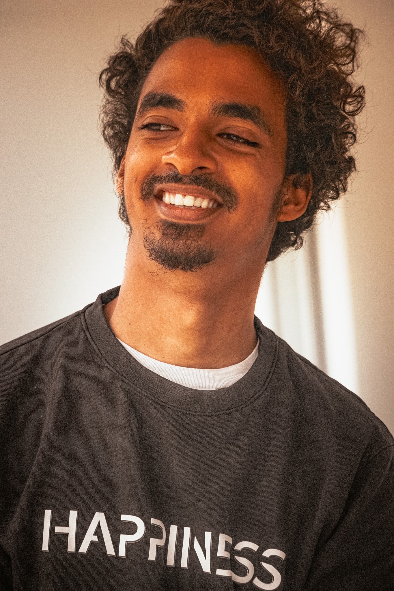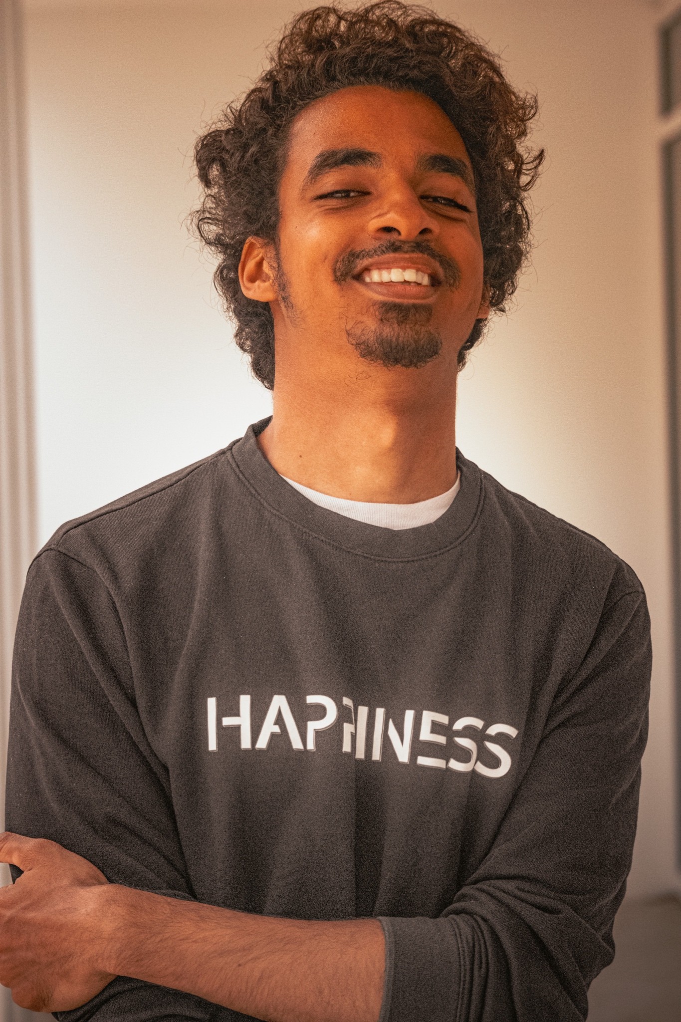 “Mr Happiness” est un nom qui fonctionne comme une étiquette narrative, un personnage mi-réel mi-construit. Il renvoie à la fois à une quête personnelle et à une projection collective du bonheur : chacun peut voir en lui un ami, un frère, un passant qui donne envie de sourire. Le nom joue aussi sur une simplicité graphique qui colle parfaitement à la sobriété du shoot. L’expression “Mr” donne une identité directe, presque évidente, à ce porteur de vibes, qui incarne ici une attitude de bienveillance et d’équilibre.