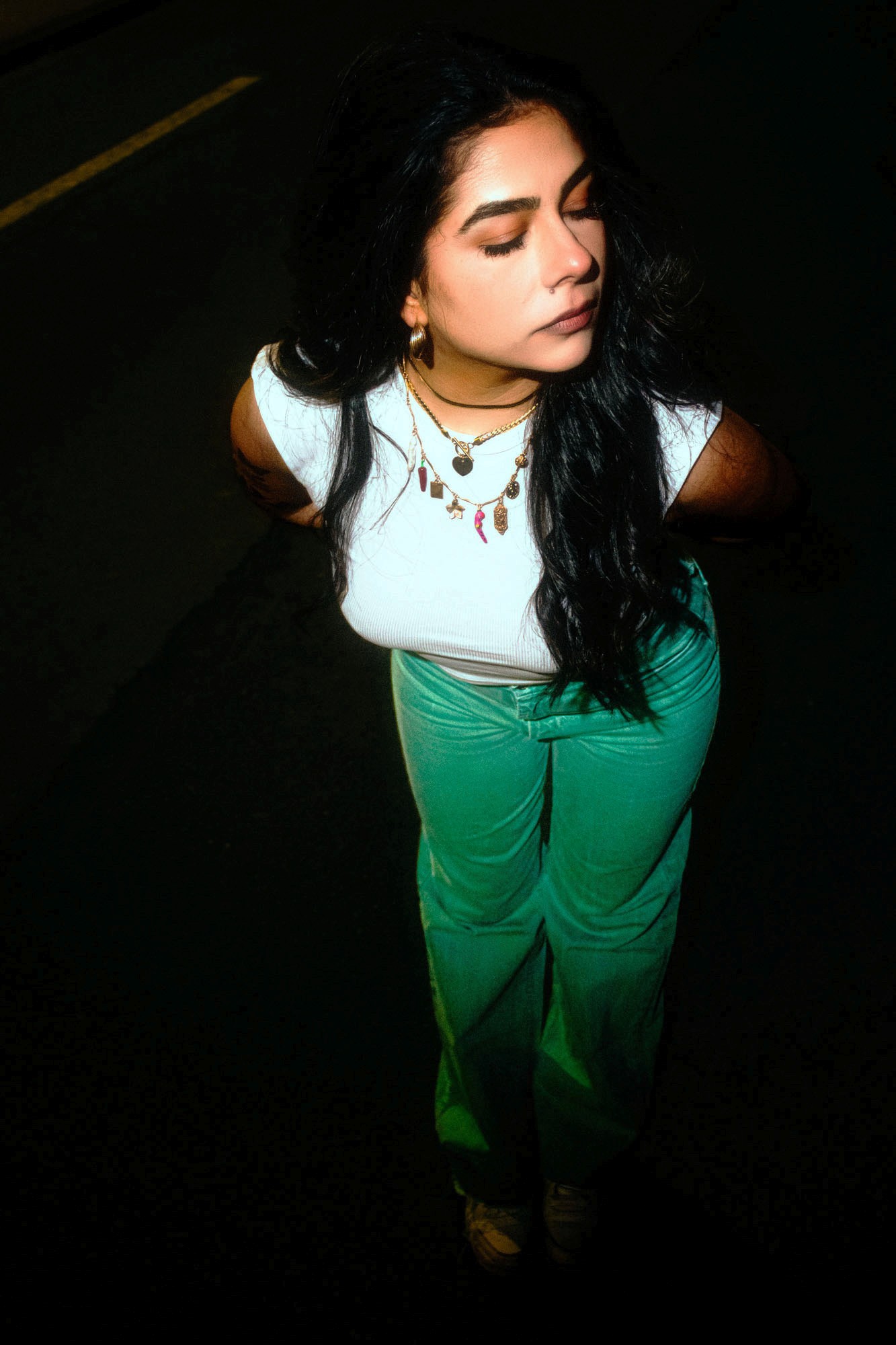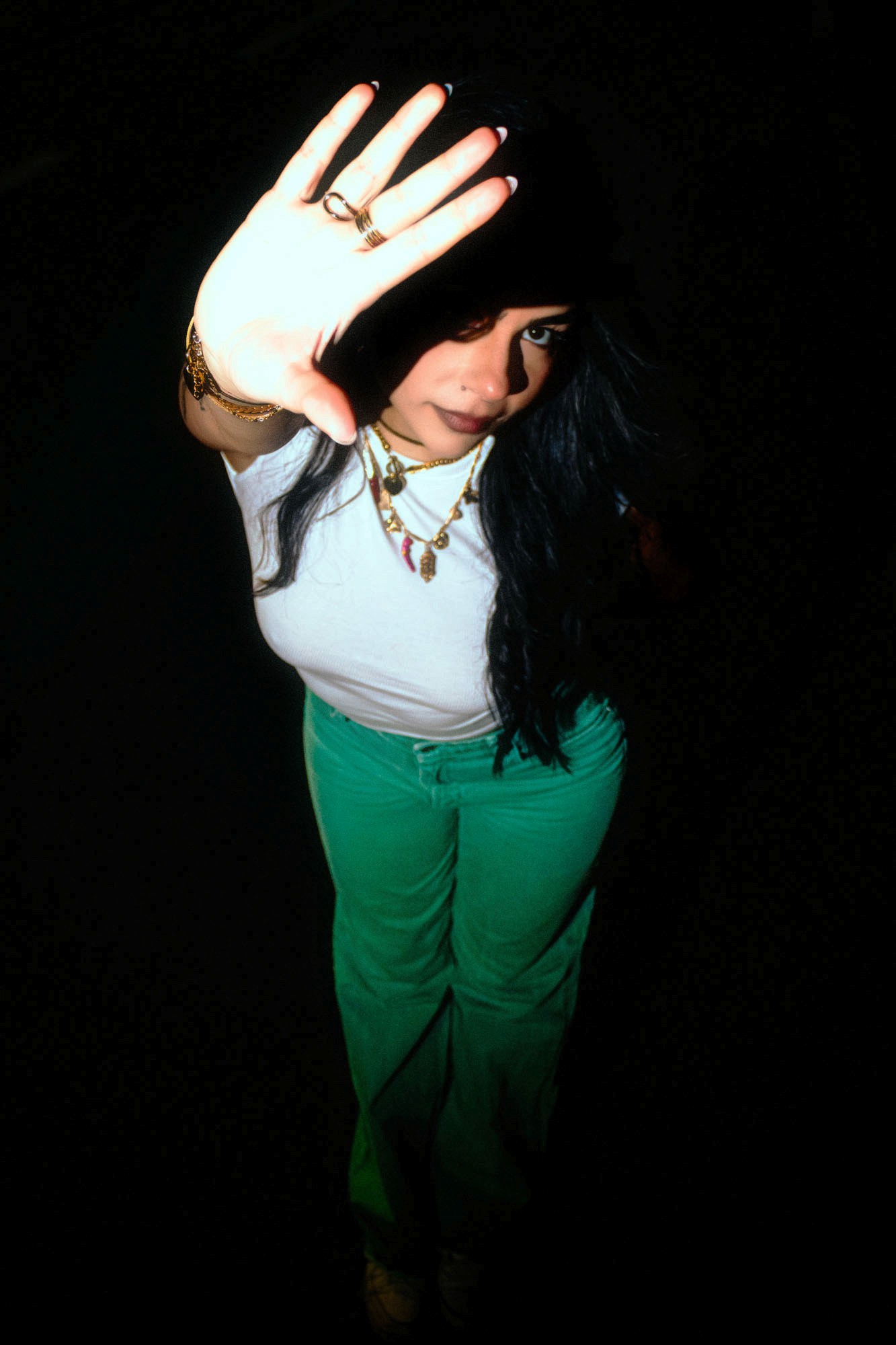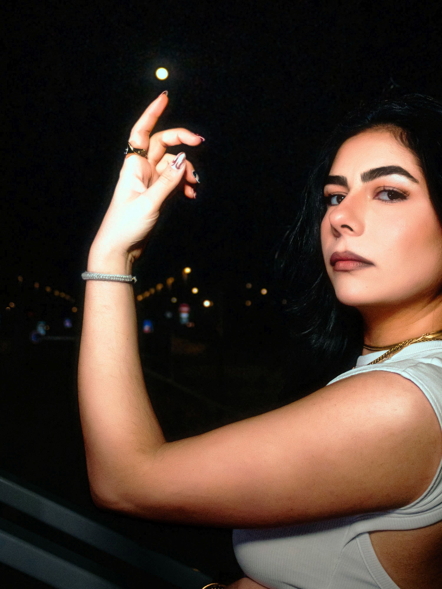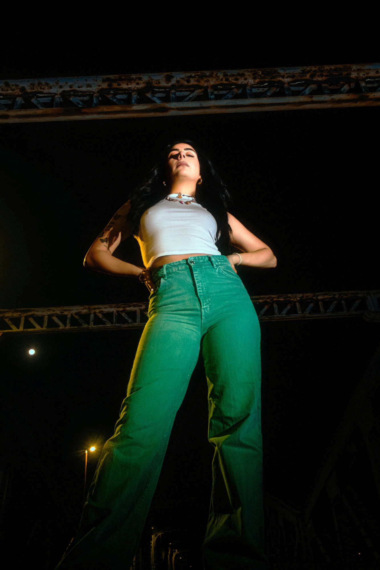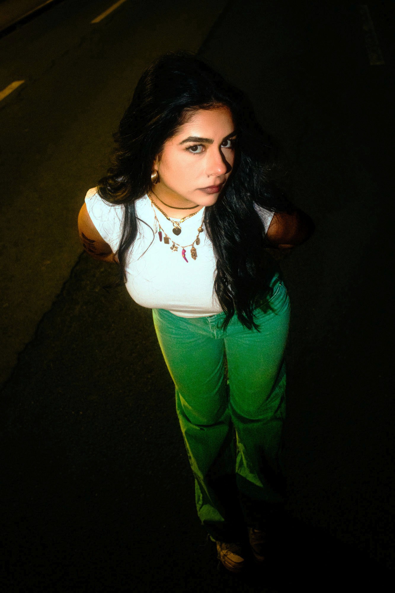 Y a un truc très ciné là-dedans, qui me fait penser à certaines scènes de Drive ou aux compositions de Nicolas Winding Refn. Aussi un peu l’énergie de shoots comme ceux de Harley Weir quand elle joue avec la nuit et les textures brillantes. Et dans la manière de figer la posture, je retrouve des vibes presque issues de comics ou d’affiches rétro-futuristes.