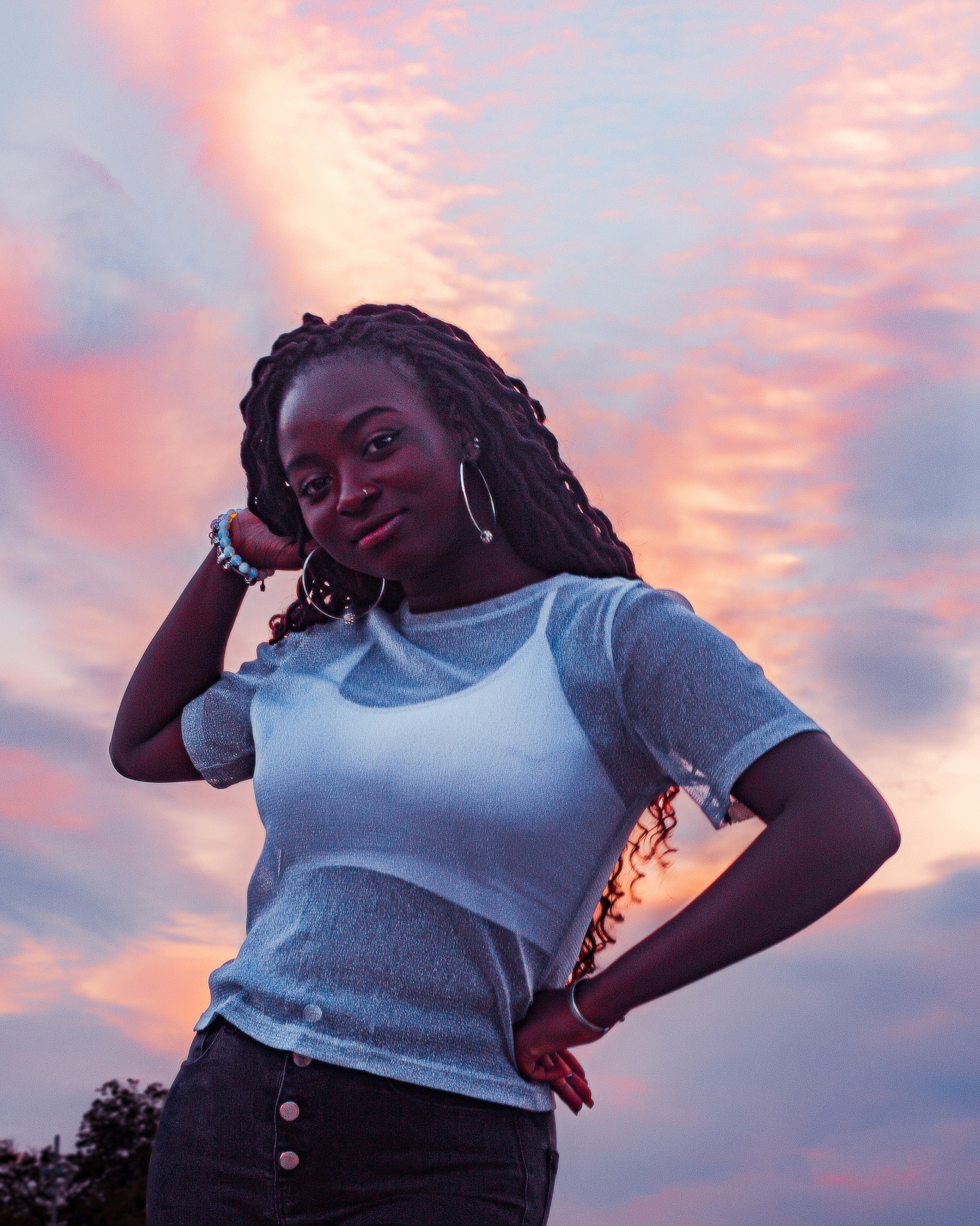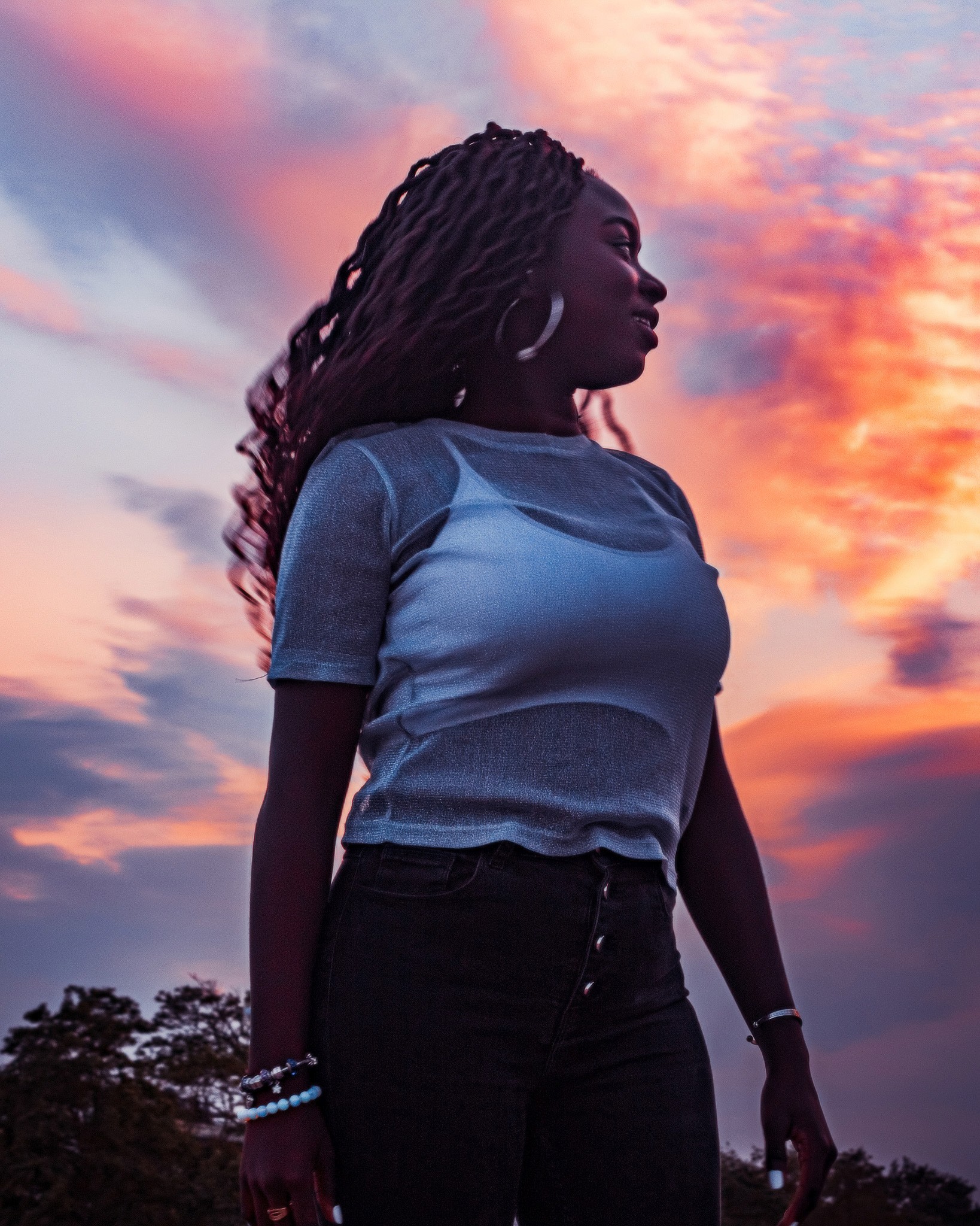 Je pensais aux derniers plans de certains films de Barry Jenkins, où la couleur prend le relais de la parole. Y’a un peu de Ren Hang dans la façon de jouer avec l’isolement d’une silhouette contre le ciel. Et pour l’allure féminine assumée sans surjeu, peut-être une réminiscence de Solange dans ses visuels épurés mais précis.