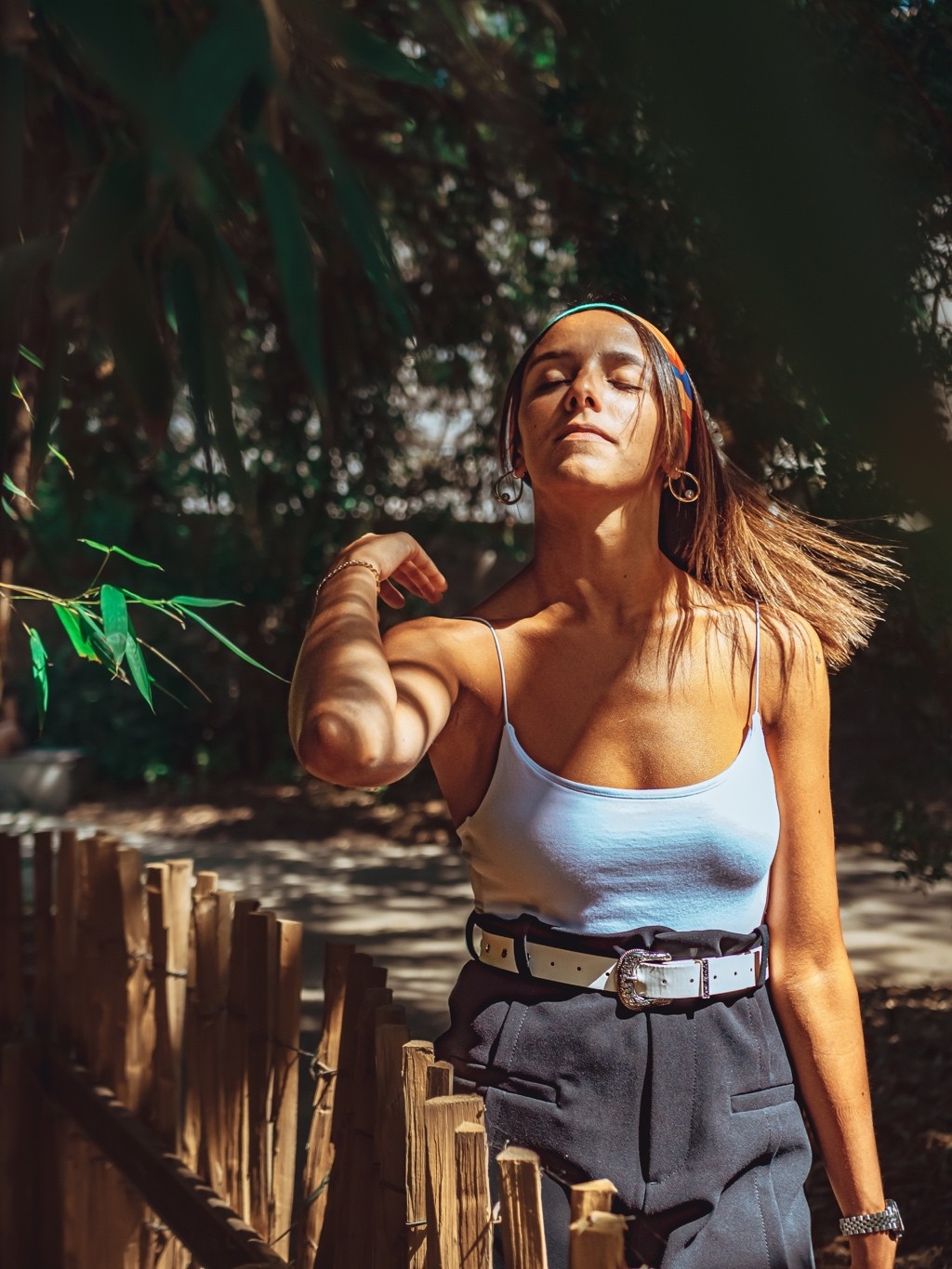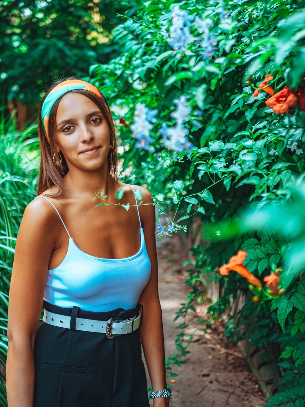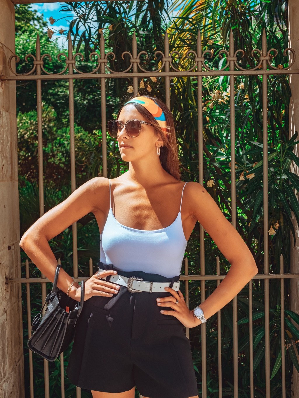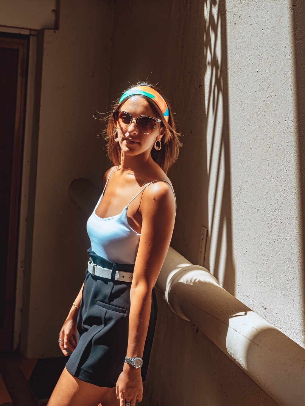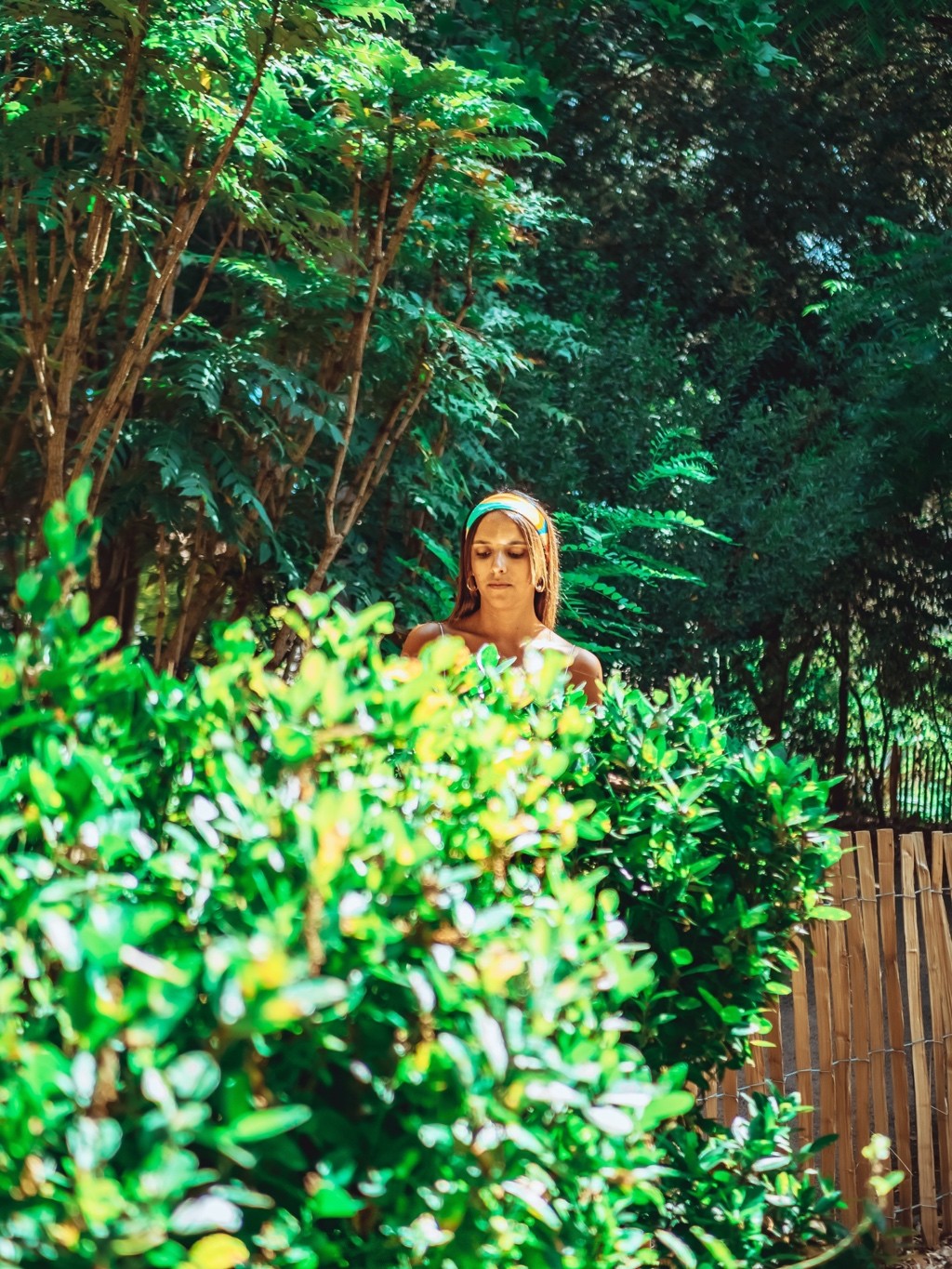 J’avais en tête des palettes à la Wes Anderson, mêlées à des vibes tropicales plus organiques. C’est un peu une balade visuelle entre une pub pour Hermès des années 70 et une scène d’Arrietty. Les contrastes forts et les coupes graphiques des vêtements font ressortir le corps sans le détacher du décor.