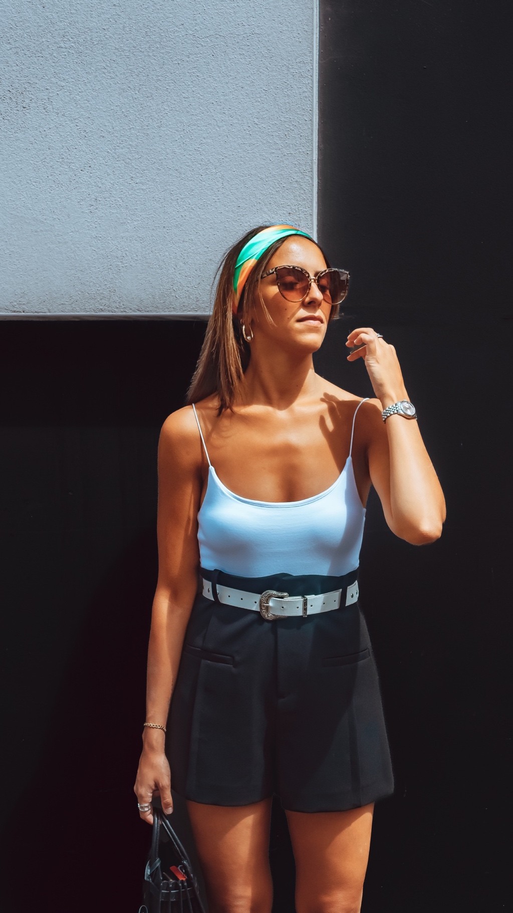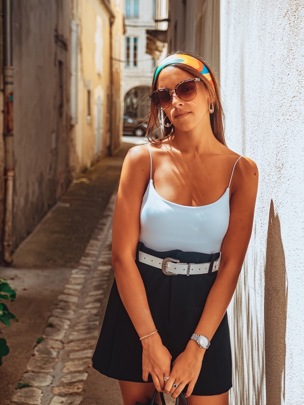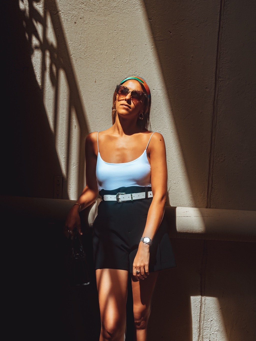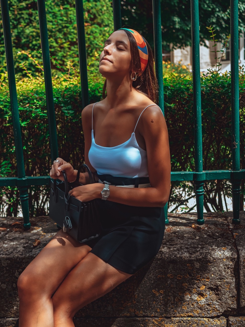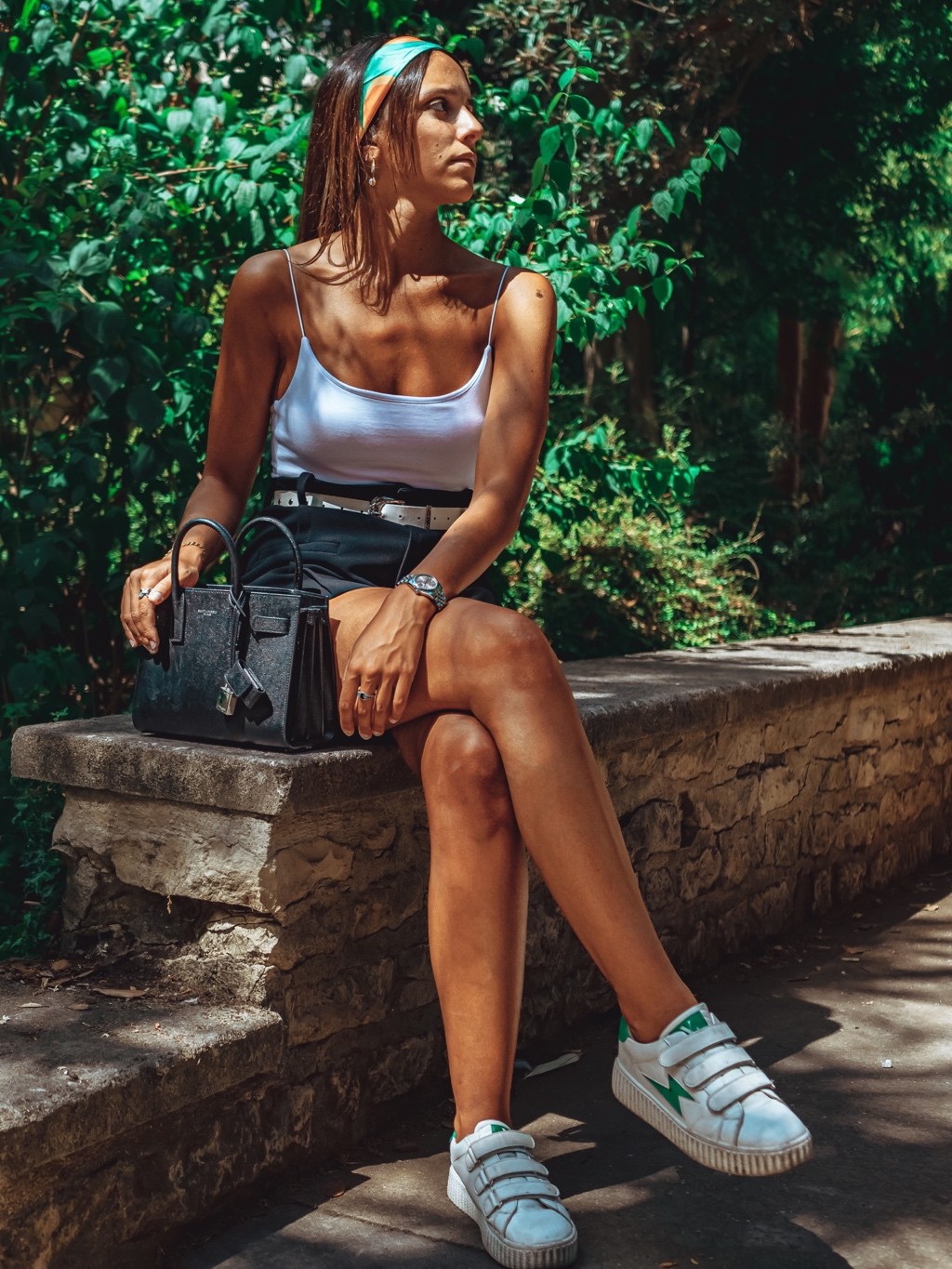J’avais en tête des palettes à la Wes Anderson, mêlées à des vibes tropicales plus organiques. C’est un peu une balade visuelle entre une pub pour Hermès des années 70 et une scène d’Arrietty. Les contrastes forts et les coupes graphiques des vêtements font ressortir le corps sans le détacher du décor.
