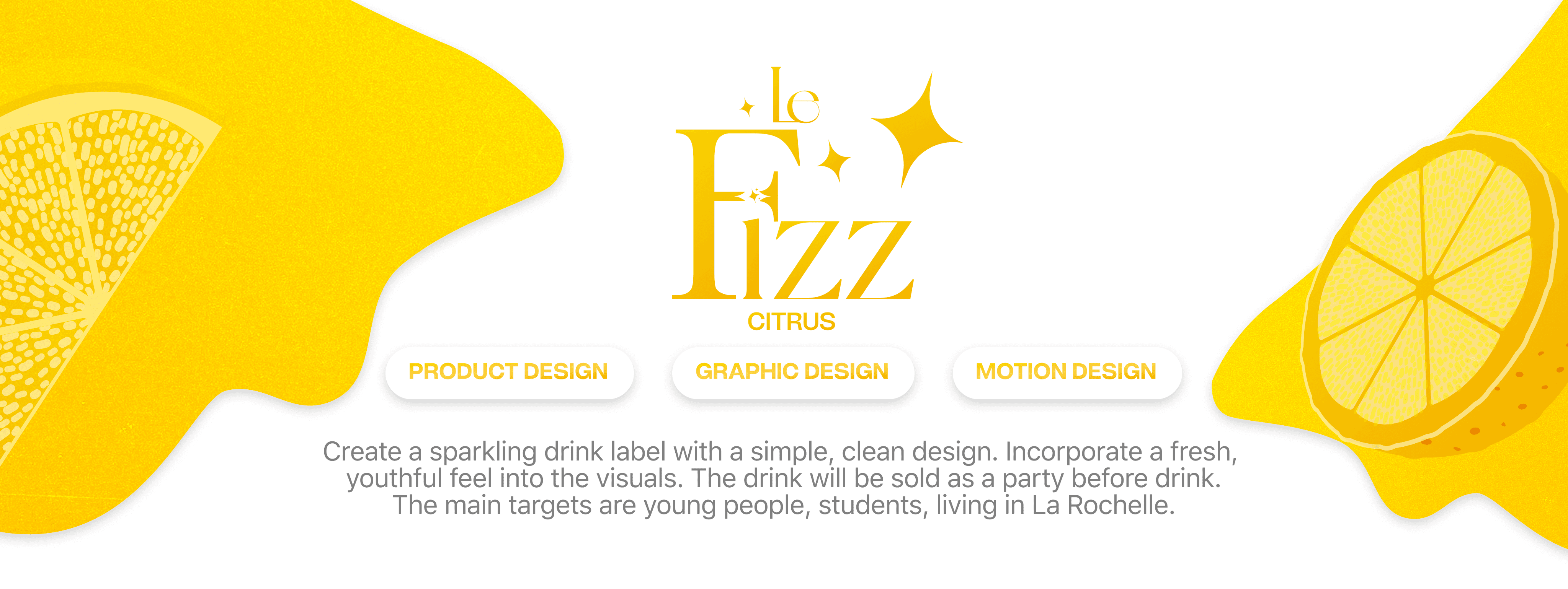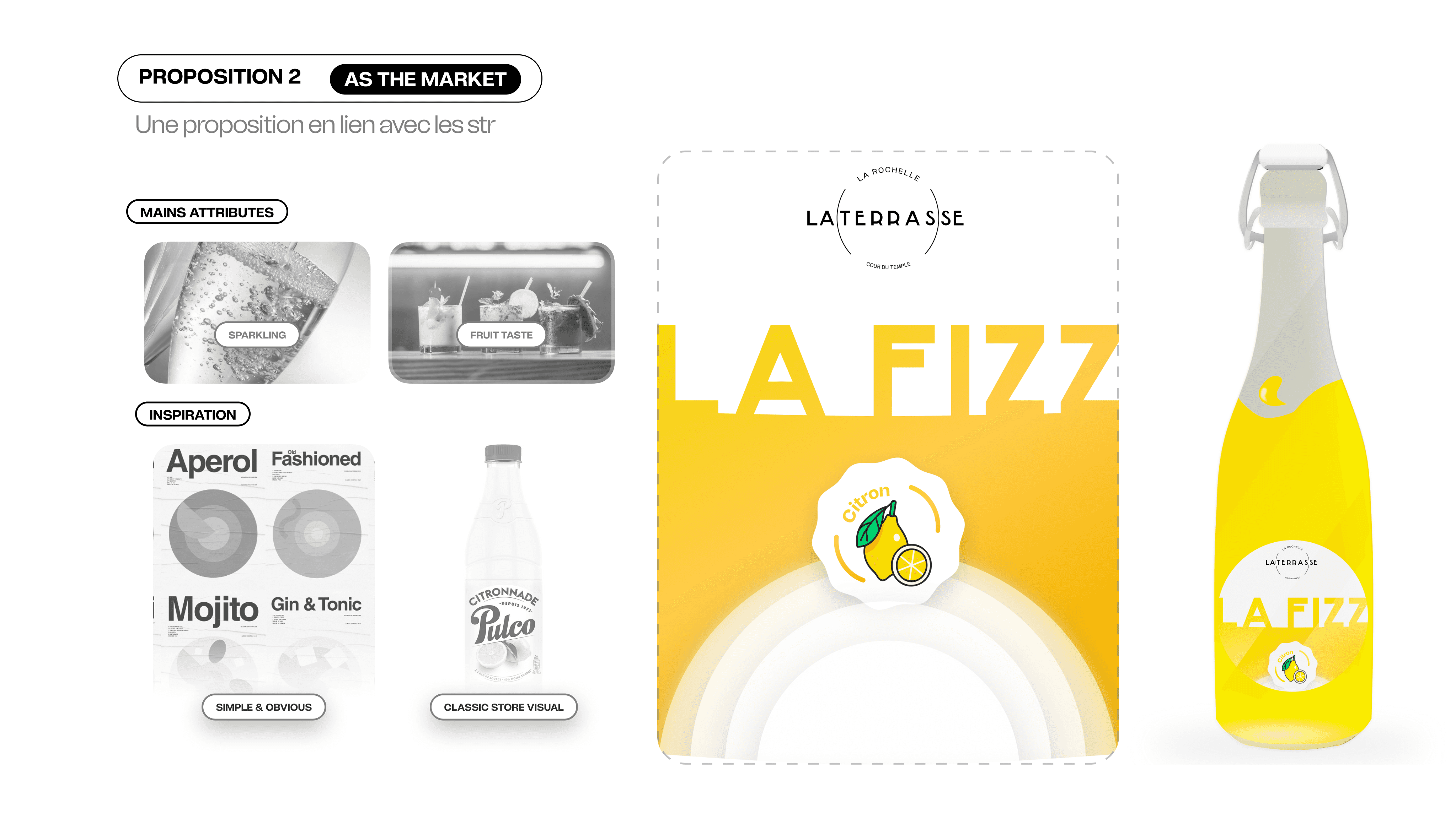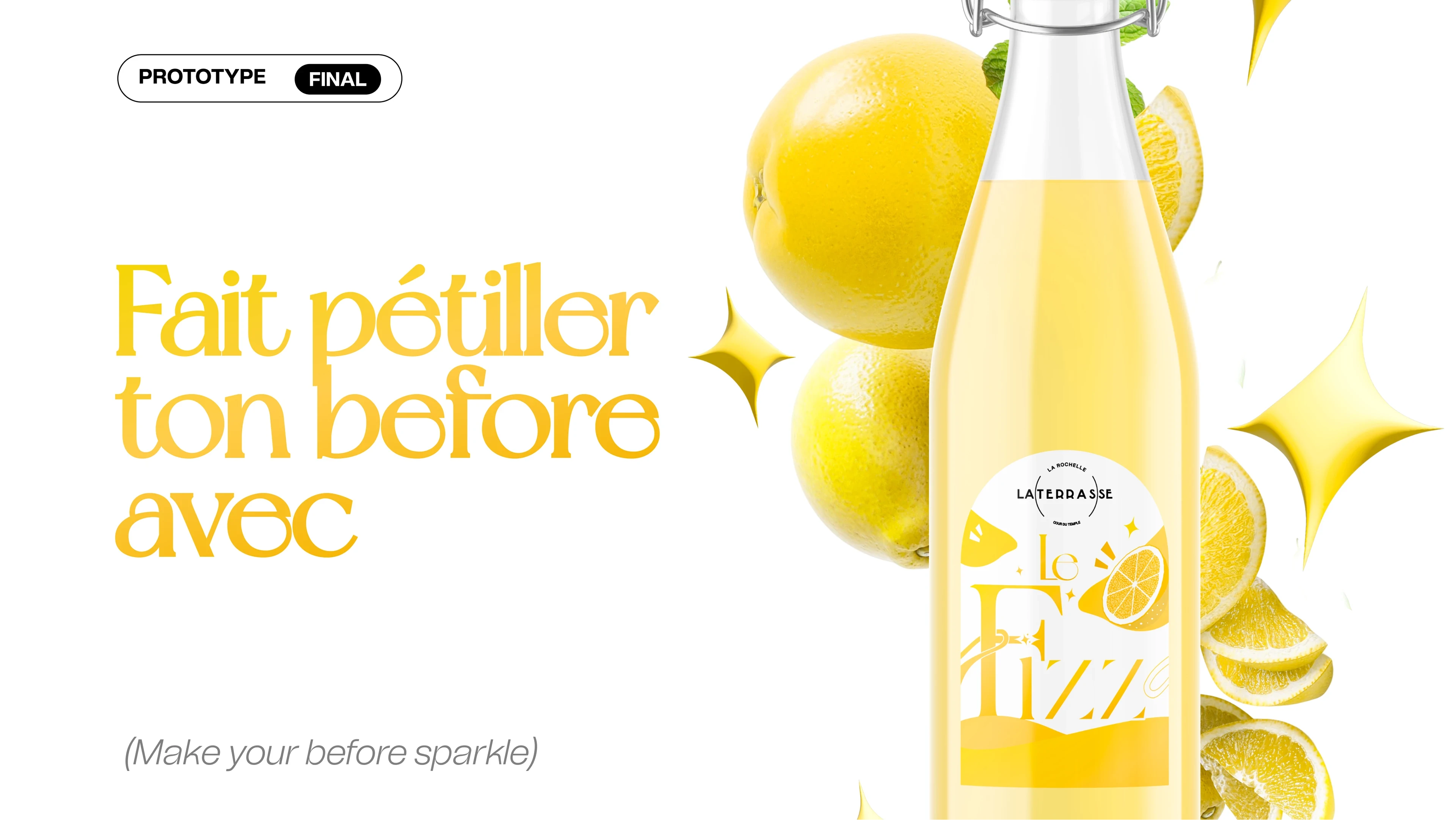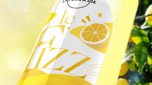 Création de l'univers Le Fizz : naming, logo, packaging citrus, palette jaune citron, typographies élégantes, moodboard, vidéo teaser et kit réseaux sociaux.
