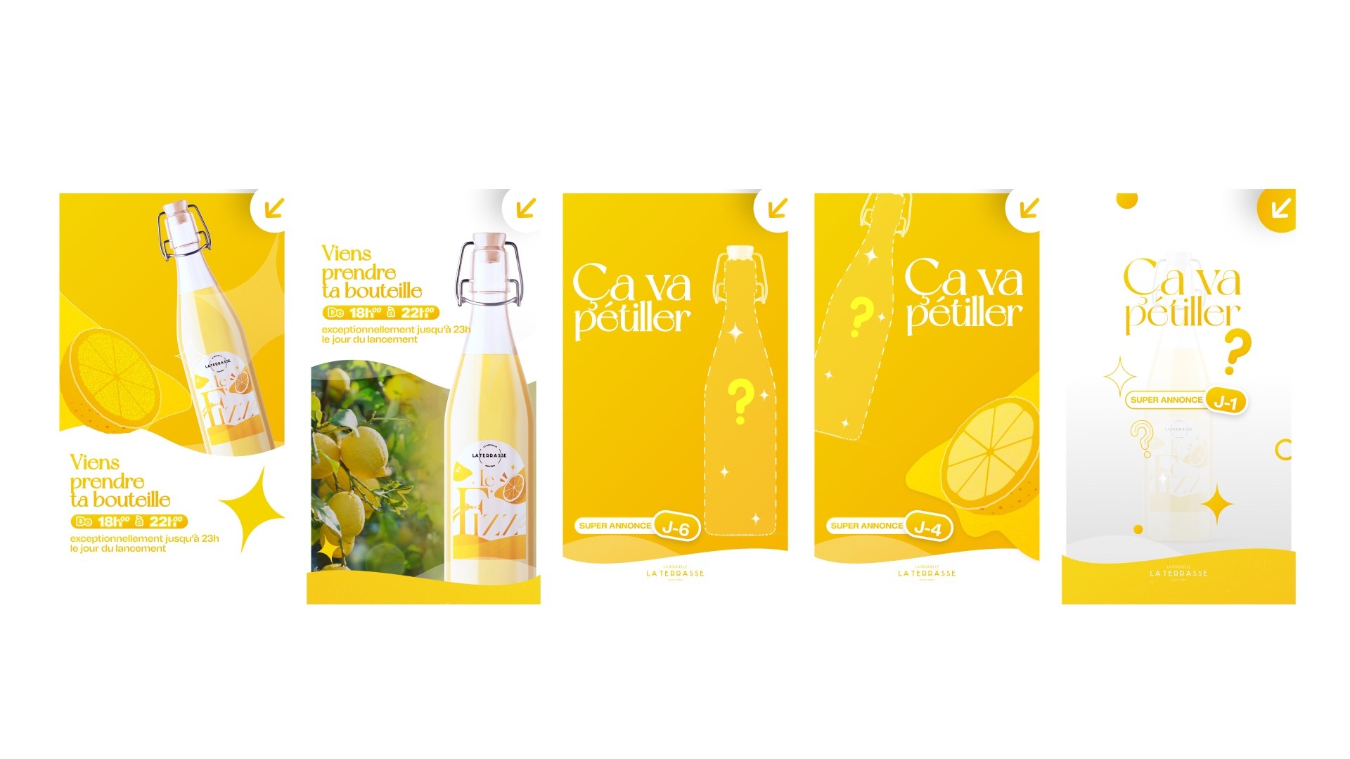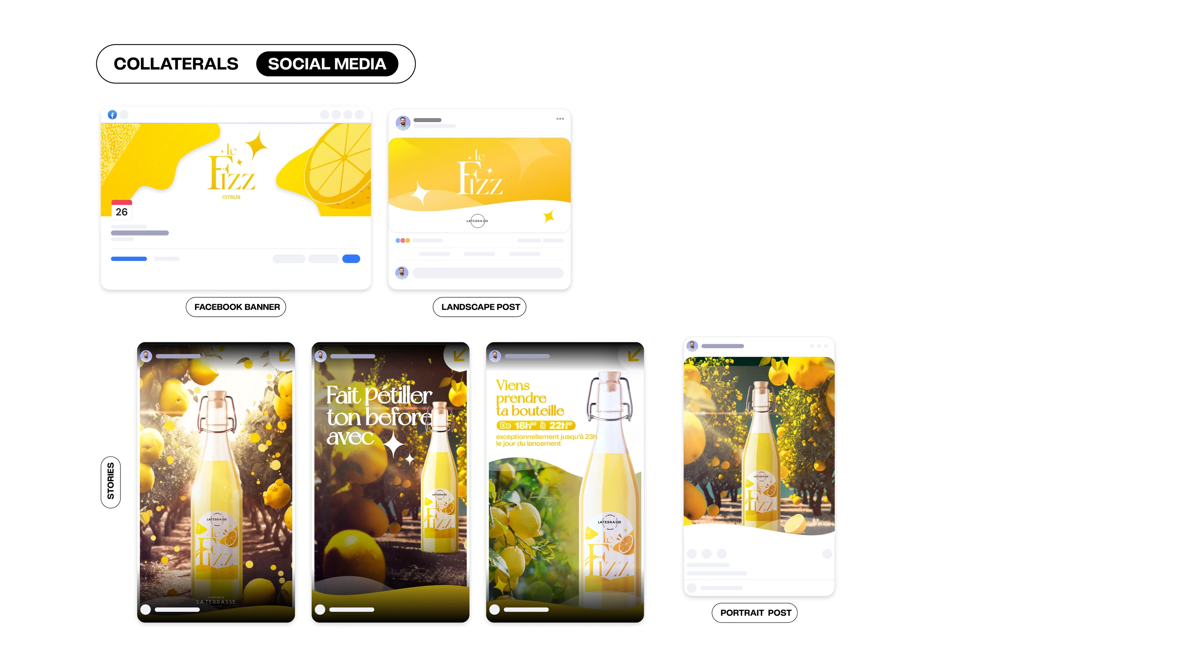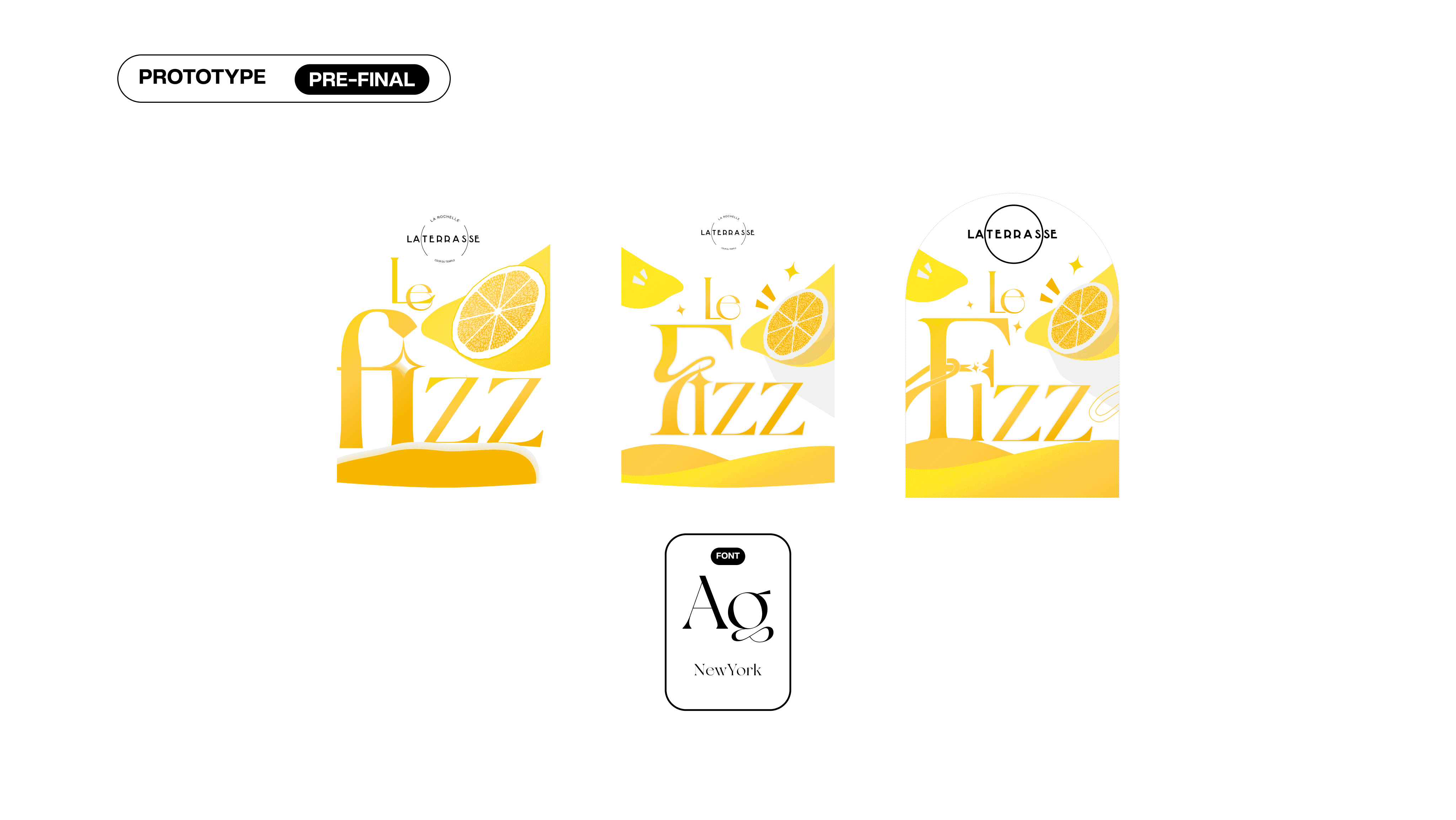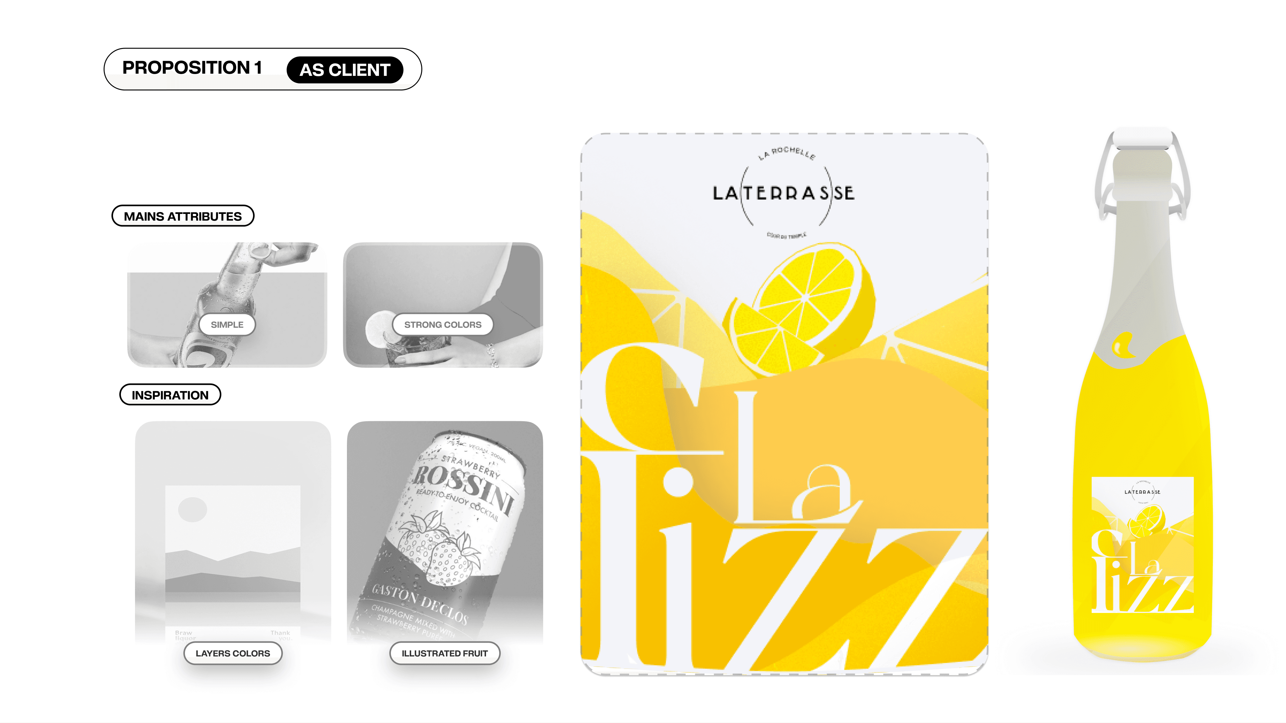 Création de l'univers Le Fizz : naming, logo, packaging citrus, palette jaune citron, typographies élégantes, moodboard, vidéo teaser et kit réseaux sociaux.
